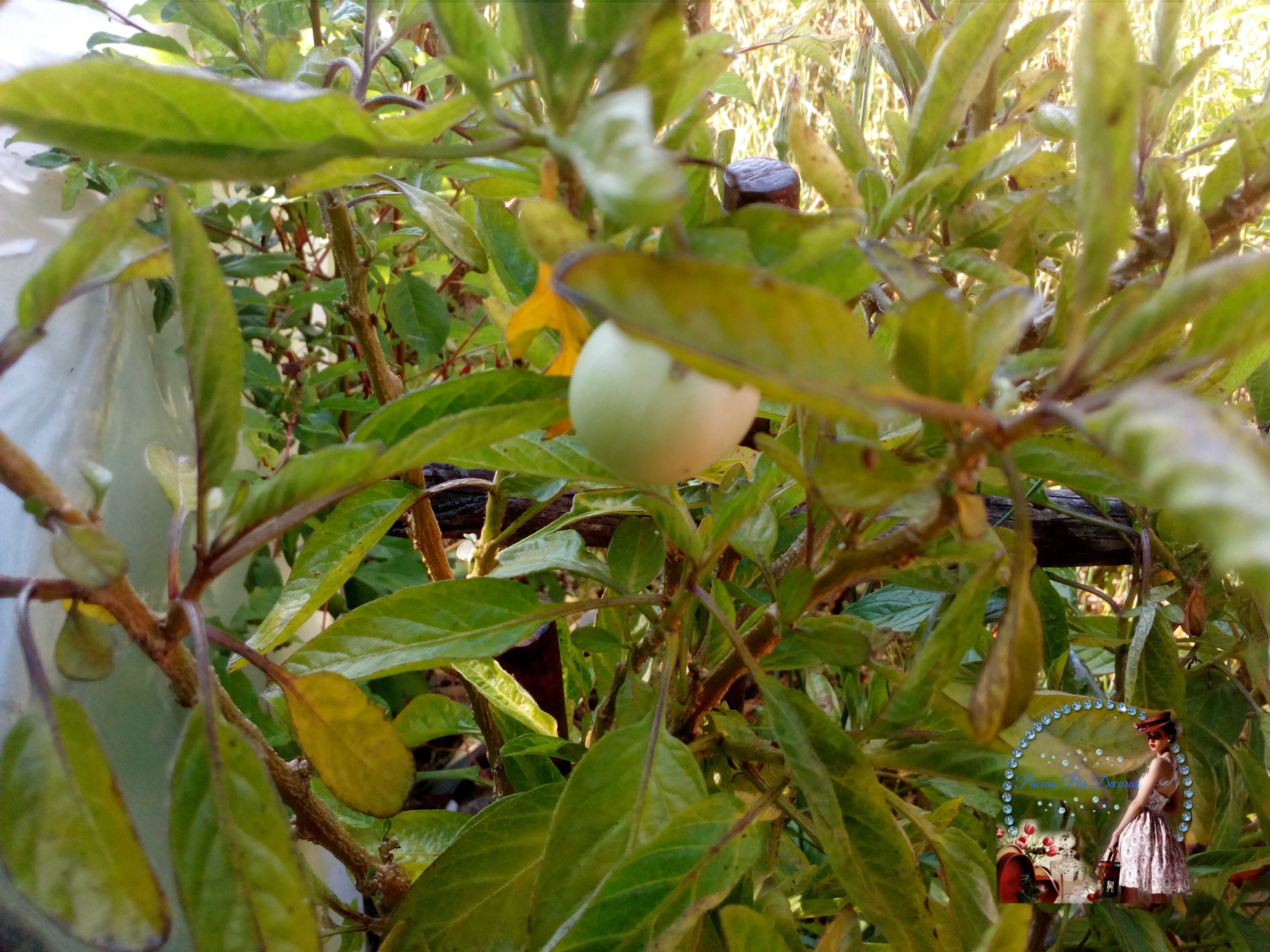 Ela dá flores pequenas e delicadas, que depois se transformam nos frutos dourados com risquinhas roxas.